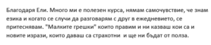 - Защото знам, че времето Ви е ценно и искам да го оползотворим на максимум. В курса няма нищо излишно. Фокусираме се върху най-основната граматика и говоренето, за да започнете да ги прилагате успешно в ежедневието си.